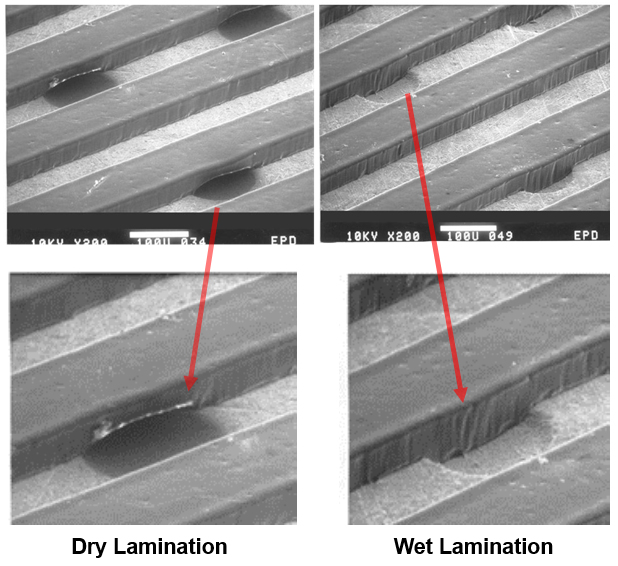 The older dry lamination process common in the offset printing industry or the newer more versatile wet lamination process which is dominant in the flexo label industry.